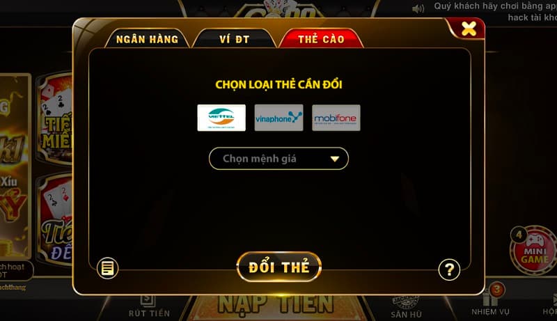 - Bước 3: Tiếp theo, người chơi sẽ lựa chọn mệnh giá mà bạn muốn quy đổi từ thẻ nạp điện thoại của mình.